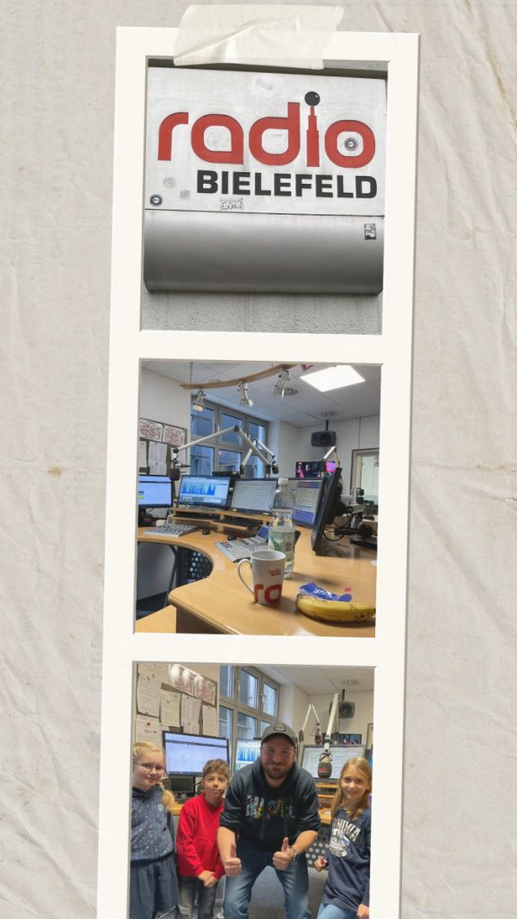 Das besondere an dieser Reise war aber, dass Alfons und Krätze nicht alleine bei Radio Bielefeld gewesen sind. Drei Kinder aus unserem Grundschulverbund haben sie begleitet und durften dem Morningshow-Moderator und Stadionsprecher von Arminia Bielefeld, Sebastian Wiese, einige Fragen stellen. Diese Fragen wurden zuvor von den Drittklässlern gesammelt.