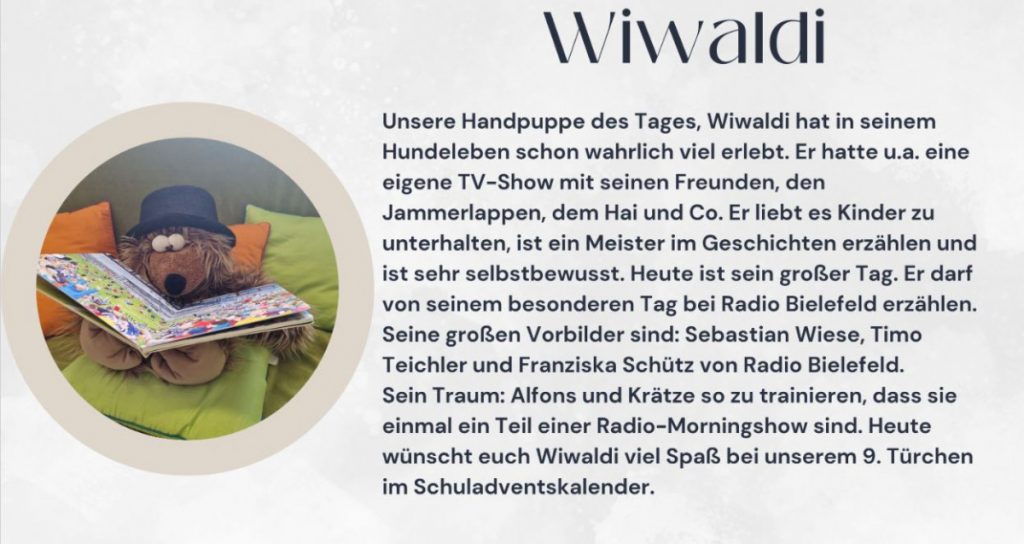 Was hilft dabei? Natürlich gute Musik und vielleicht auch ein paar gut gelaunte Moderatoren. Wiwaldi (Beschreibung der Handpuppe des Tages unter dem Video) ist ein großer Fan von Radio Bielefeld und speziell von Sebastian Wiese, Timo Teichler und Franziska Schütz aus der Morningshow. Er hat Alfons und Krätze den Tipp gegeben, morgens immer Radio Bielefeld zu hören. Dann ist der Start in den Tag, definitiv gerettet. Und weihnachtlich ist es dort auch schon sehr. Im Studio steht ein bunter Weihnachtsbaum und ab und zu läuft auch Weihnachtsmusik.