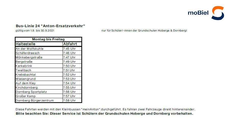 Liebe Eltern, bitte beachten Sie am Standort Hoberge auf Grund der Baustelle die geänderten Buszeiten.